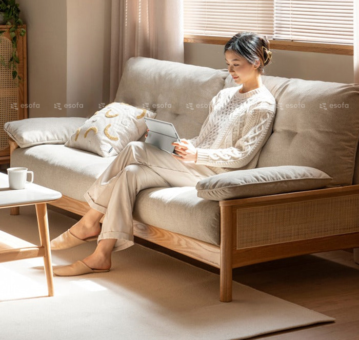 Chi tiết mây đan được lồng ghép ở mặt ngoài tay ghế không chỉ mang lại nét duyên dáng, mà còn giúp sofa trở nên thoáng nhẹ, gợi cảm giác gần gũi với thiên nhiên – đúng tinh thần “Zen” trong nội thất hiện đại.