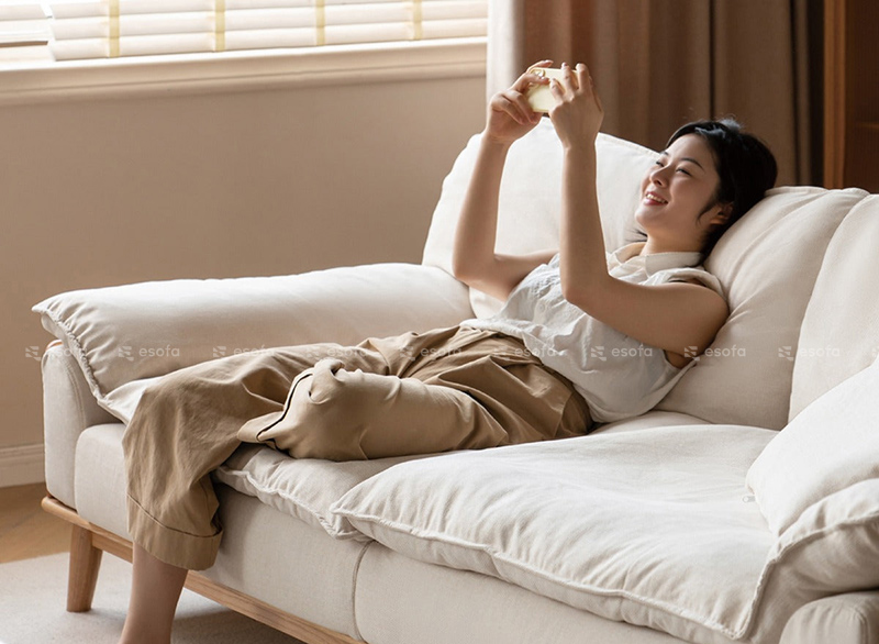 Các đường may được xử lý tinh tế, đặc biệt là phần viền mép gấp nhẹ tạo độ phồng tự nhiên, giúp sofa trông như một “đám mây êm ái” nổi trên khung gỗ.