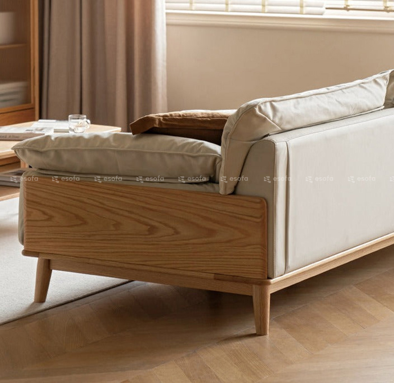 Bên ngoài tay ghế là khung gỗ sáng màu được gia công tỉ mỉ, liền mạch với phần chân – vừa mang tính trang trí, vừa giúp tổng thể sofa gọn gàng và thanh thoát hơn.