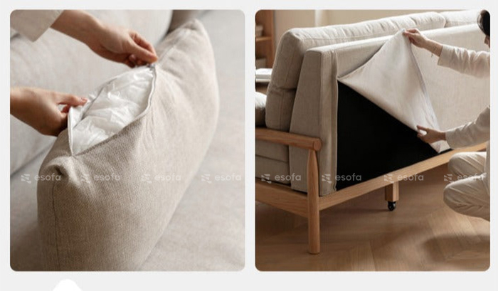 Tông vải kem sáng dịu mắt cùng phần khung gỗ mộc tự nhiên khiến chiếc sofa khi mở ra thành giường vẫn giữ nguyên vẻ ấm cúng, thanh lịch và tinh giản đúng phong cách Bắc Âu.