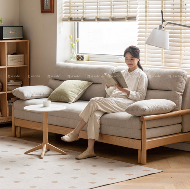 Sự kết hợp giữa khung gỗ tự nhiên và phần đệm tay bọc vải dày phồng giúp sofa vừa có độ chắc chắn, vừa giữ được nét mềm mại, dễ chịu.