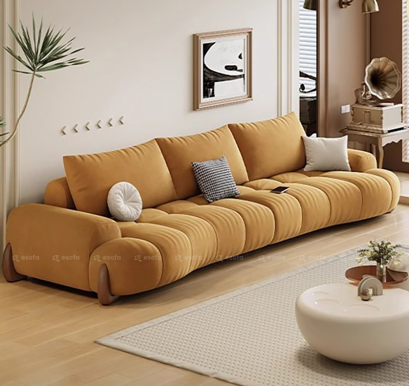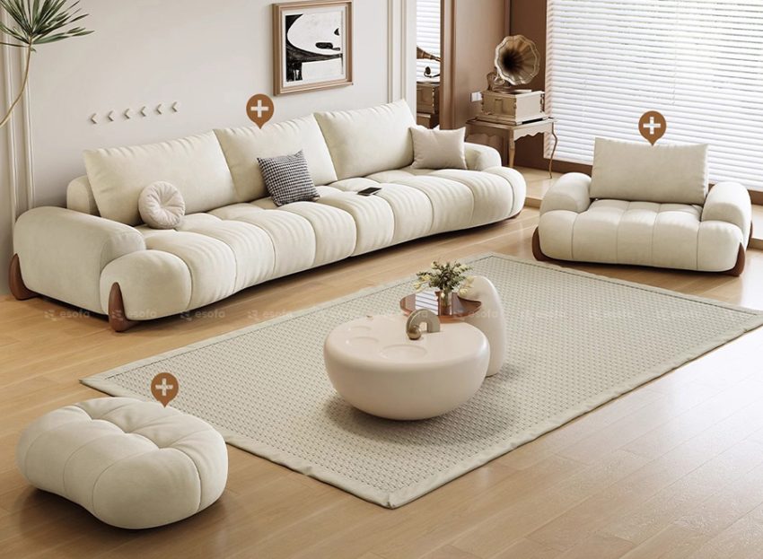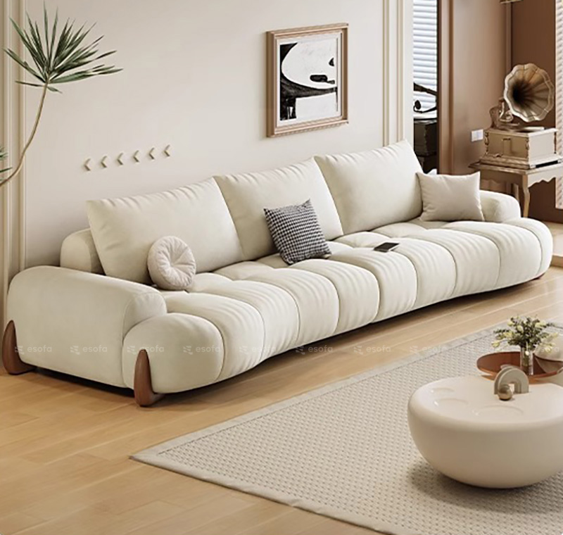 Mẫu sofa này gây ấn tượng bởi đường cong uốn lượn mượt mà, gam màu kem sáng thanh nhã và tỷ lệ thiết kế chuẩn mực, mang đến cảm giác thư giãn, nhẹ nhàng cho không gian sống.