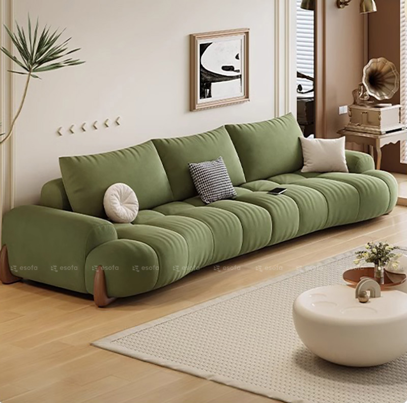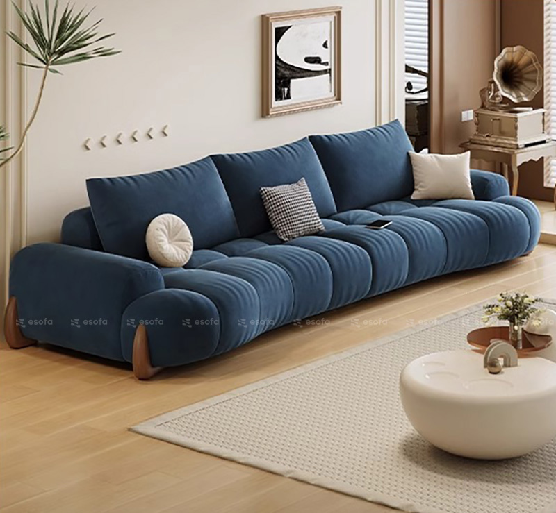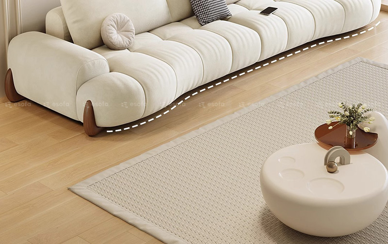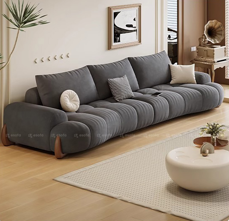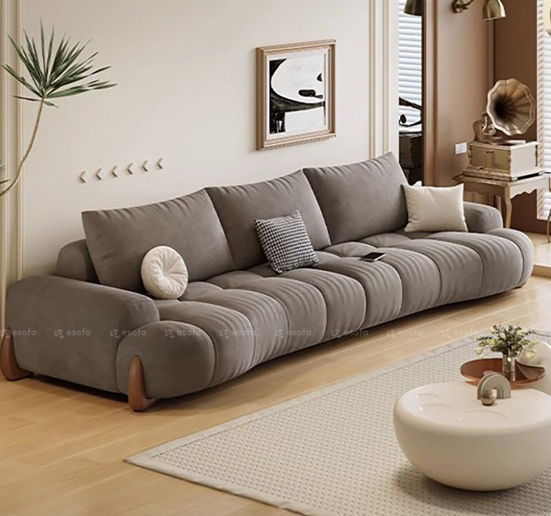 Các múi đệm được chia thành từng đường cong đều đặn, ôm sát theo chiều dài sofa, tạo hiệu ứng thị giác mềm mại và cực kỳ cuốn hút.