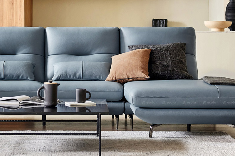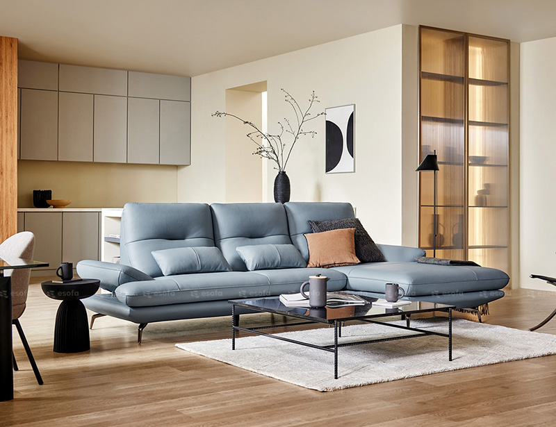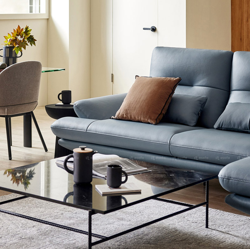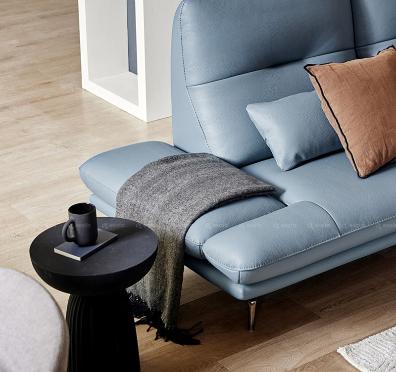 Sofa E11 được thiết kế với đường nét tối giản, hiện đại nhưng không kém phần tinh tế. Phần lưng ghế cao kết hợp với đệm ngồi dày dặn tạo nên cảm giác chắc chắn, bề thế. Sự kết hợp của form dáng mạnh mẽ với màu da xanh dương nhạt trang nhã mang đến một diện mạo mới mẻ, ấn tượng và dễ dàng trở thành điểm nhấn của phòng khách.