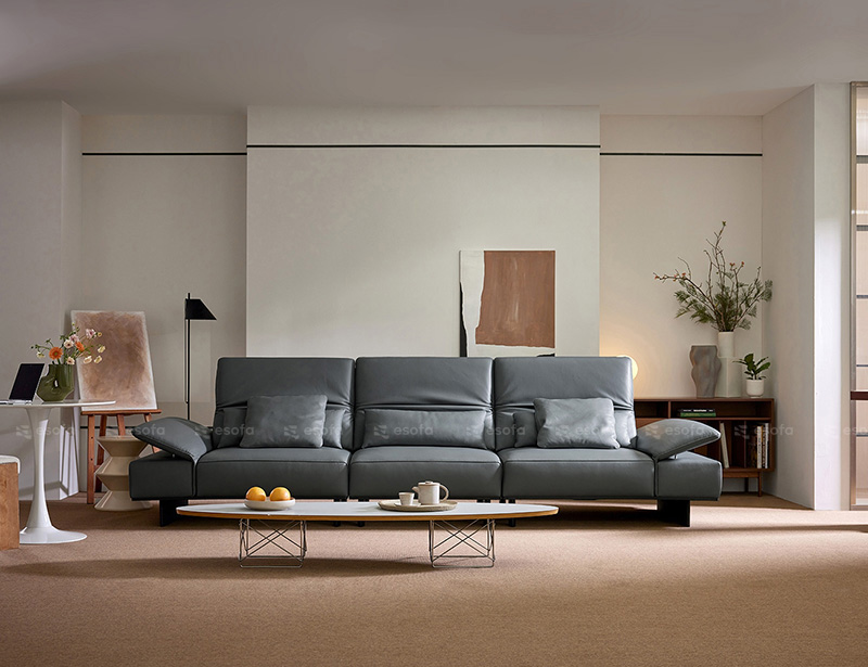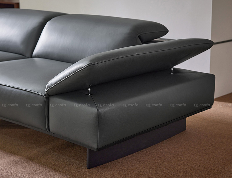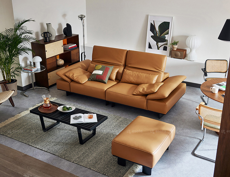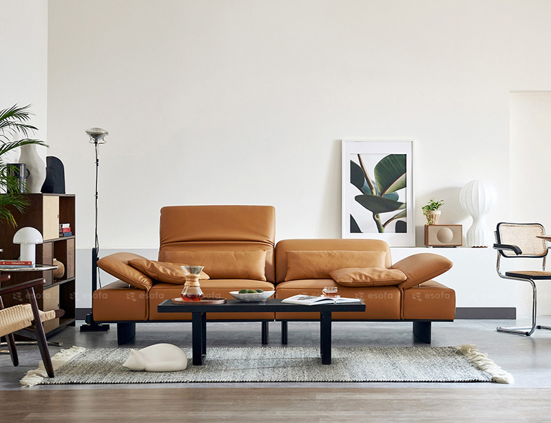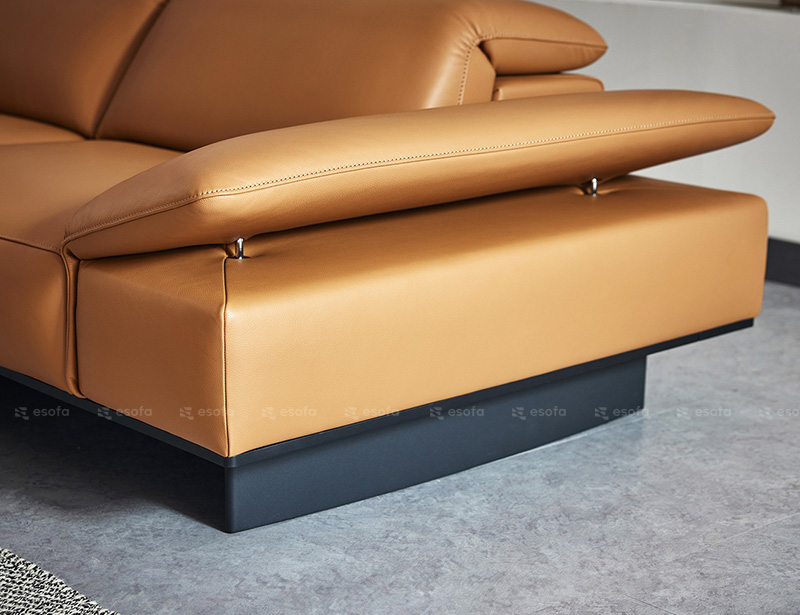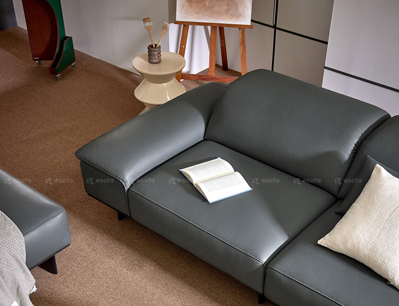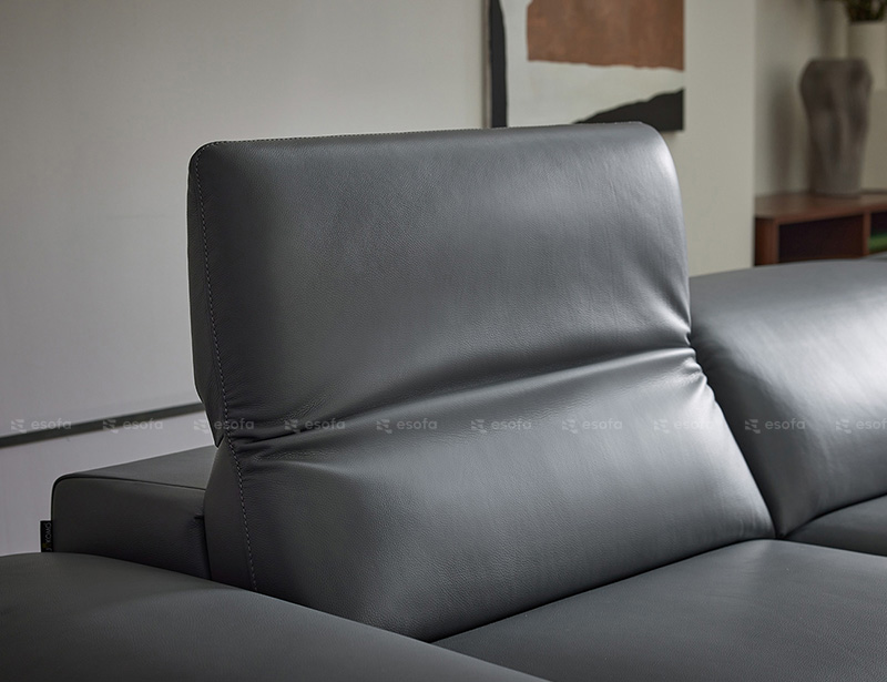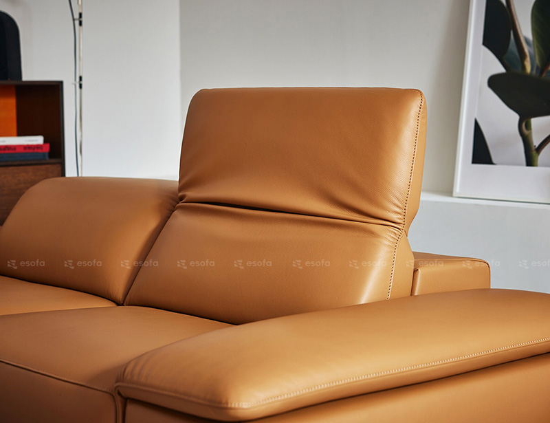 Tựa lưng của sofa E25 được thiết kế cao vừa phải, ôm trọn phần lưng người ngồi. Đệm tựa phân khối rõ ràng, mang đến cảm giác gọn gàng, không rườm rà. Bề mặt da căng mịn kết hợp với những đường chỉ khâu thẳng tắp, tạo điểm nhấn thị giác đồng thời đảm bảo tính chắc chắn.