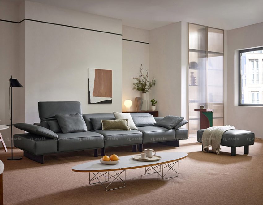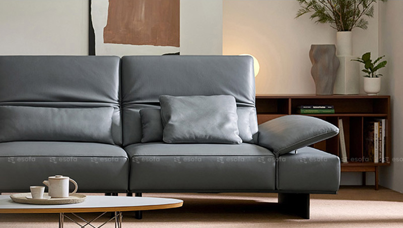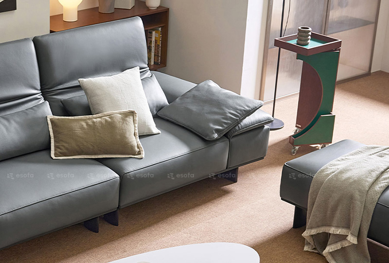 Sofa E25 đi kèm gối tựa đồng bộ, được bọc da hoặc vải cao cấp. Gối có hình dáng vuông gọn, màu sắc phối hợp hài hòa với tổng thể sofa. Đây không chỉ là chi tiết trang trí mà còn tạo thêm chiều sâu cho thiết kế, mang lại sự cân bằng cho không gian.
